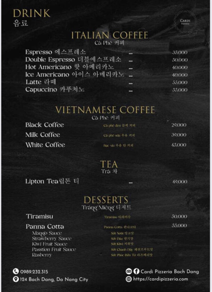Cardi Pizzeria Bạch Đằng là điểm đến lý tưởng cho những tín đồ ẩm thực châu Âu tại lòng thành phố. Với bảng menu đa dạng từ các món Pizza, Mỳ Ý đến Steak Bò Bít Tết và nhiều món ngon khác. Nhà hàng hứa hẹn mang đến trải nghiệm ẩm thực tuyệt vời.