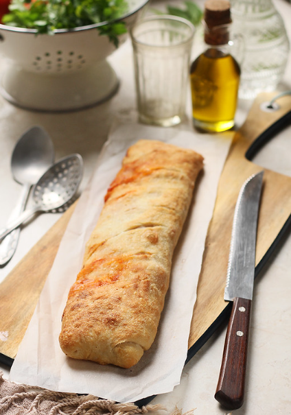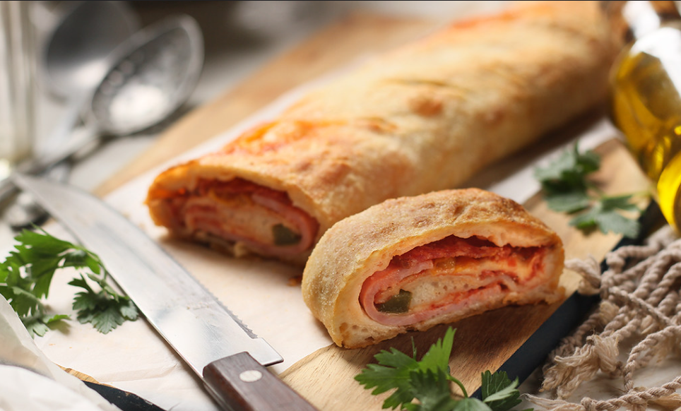 Vỏ bánh giòn tan cuộn lấy mấy loại thịt nguội, sốt cà chua quyện chặt mozzarella nóng chảy cùng với vị tươi ngọt của các loại rau củ thật dễ gây liên tưởng tới hương vị thân thuộc mà ta vẫn hay cảm nhận được trên những chiếc bánh pizza.